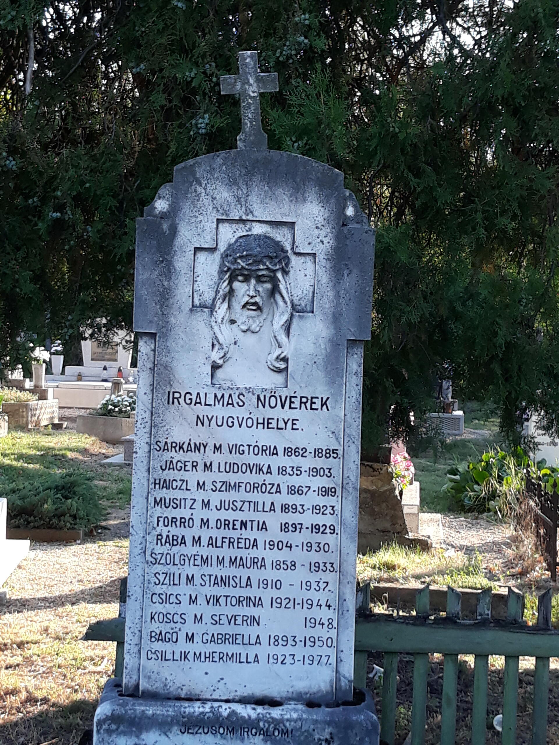 The cemetery, in use since 1759, has a large cross in the centre, erected in 1876 in memory of the deceased parish priests and nuns of the Vincés. The cemetery was also known as the "Garden of Kati Jakab" (the garden of Kati Jakab) after the beggar who lived there in the early 1910s (the writer Sándor Dallos, born in Pannonhalma, commemorates her in a short story). The southern part of the area is now adjacent to the Jewish cemetery.