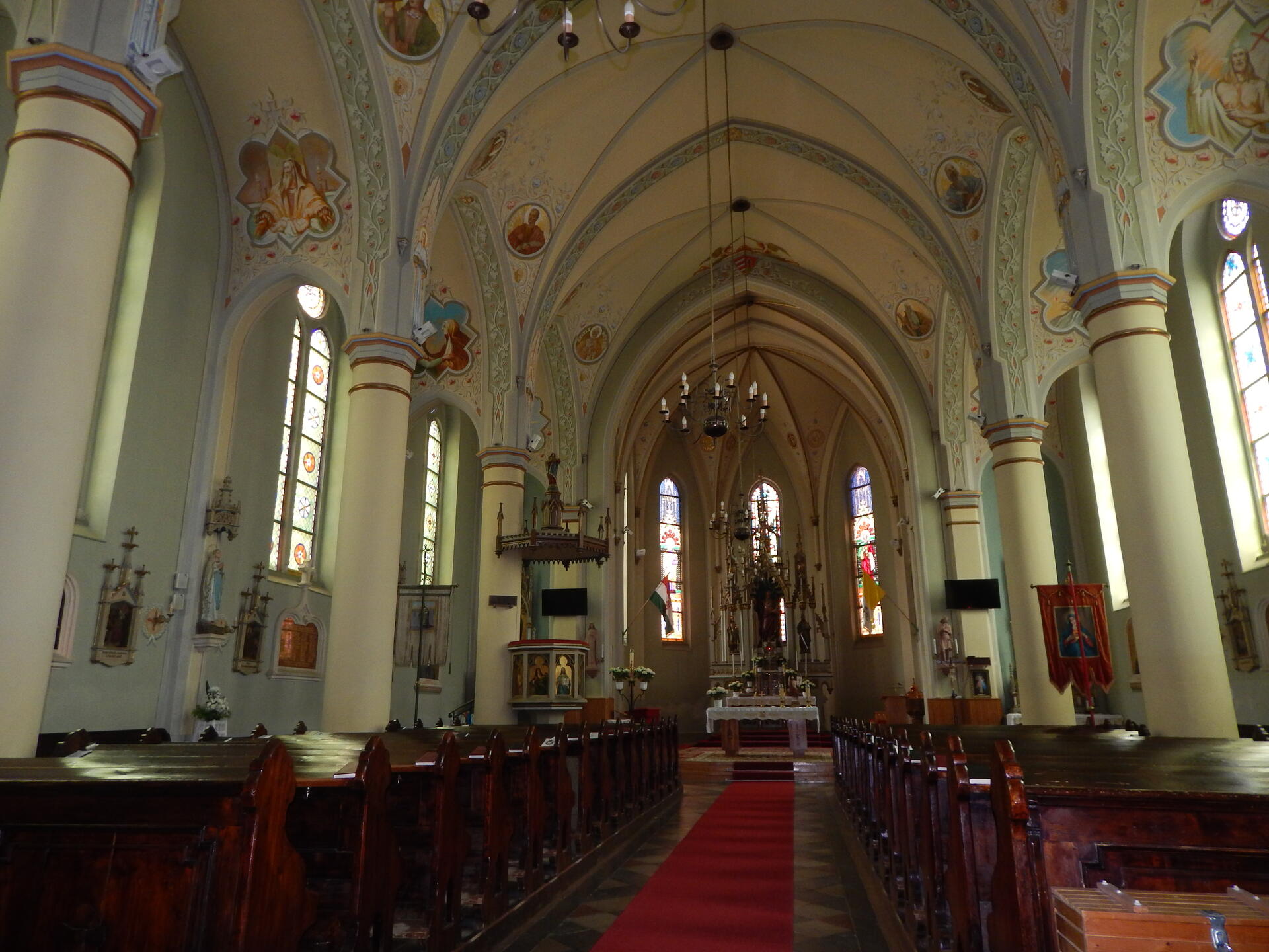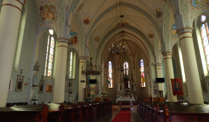 The foundations of the first church of Süttör, dating back to the 12th century, were discovered in 1906 on Jakabsziget, on the outskirts of the village. The area was probably abandoned due to the flooding of the Fertő. The Baroque church was built in 1732 on the site of the present church. It was demolished in 1889 and a new one was built in the same year. The building, designed by Lajos Zatzka of Vienna, was modelled on the Gothic churches of northern Germany. A tall tower rises in the centre of the façade, with a hussars' tower at each corner. The fields above the three gates are decorated with mosaic images (Mary, Jesus, Joseph). The marble plaque next to the Joseph Gate commemorates Mihály Mentes (1891-1960), a priest-poet born in Süttöri. He wrote, for example, the words of the hymn "We kneel for our country". The neo-Gothic interior of the church was completed in 1889. On the main altar there are statues of St. Andrew and the holy kings of the Árpád dynasty. The side altars are dedicated to the Sacred Heart of Jesus and the Virgin Mary. The organ was made in 1935 in the Rieger factory in Budapest. Among the many illustrious figures depicted on the side walls and ceiling are Pope John Paul II, Joseph of Mindszent and William of Apor (also the 20th century's heroes).