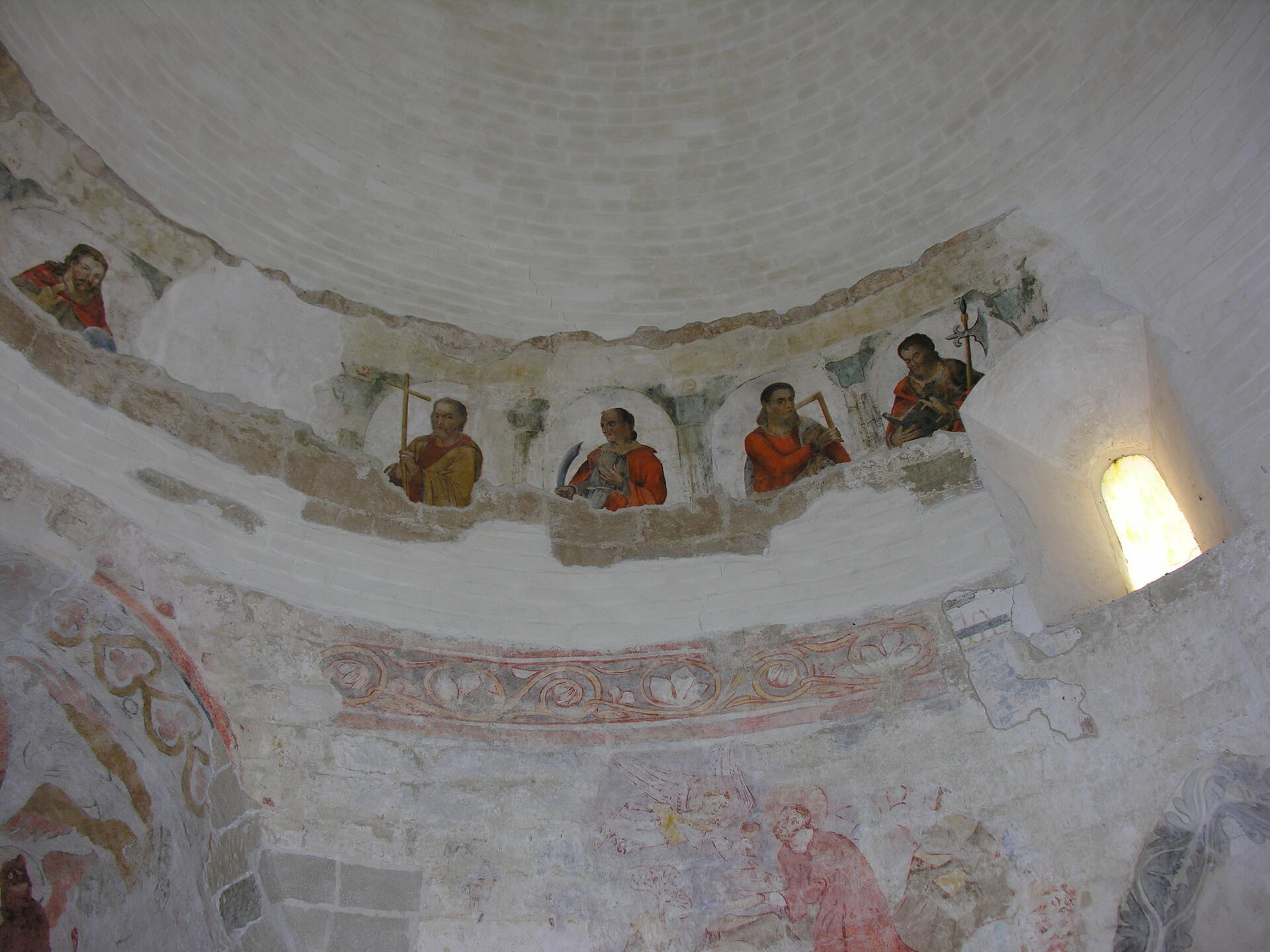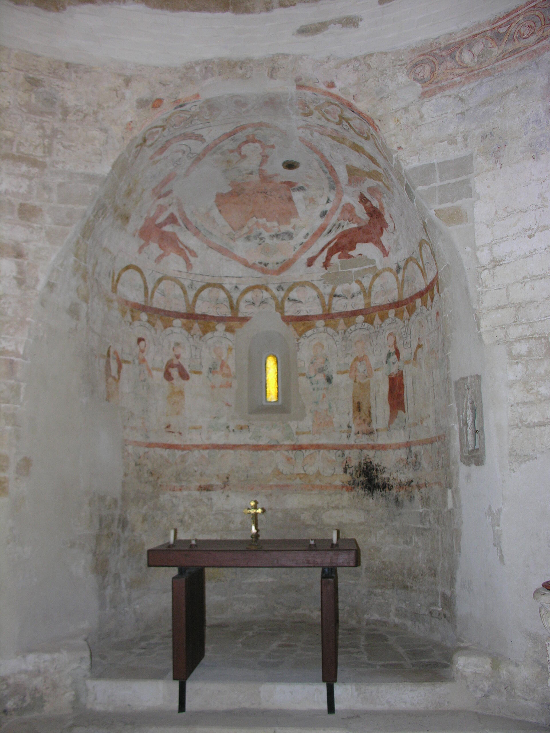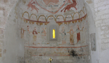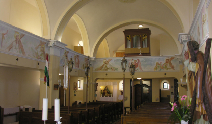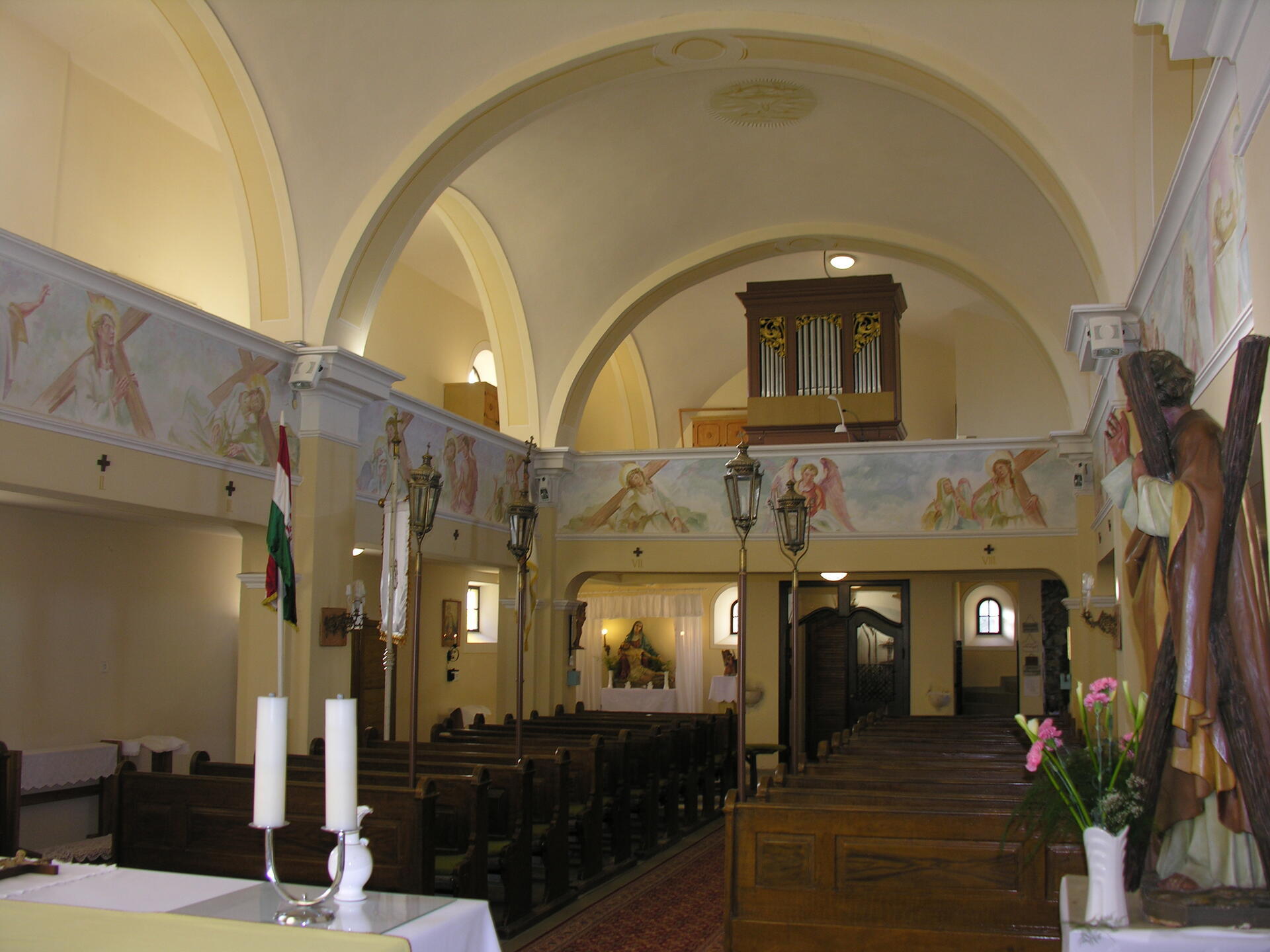 The round chapel of the church on the hill above the village was built in the 12th century. The interior of the originally free-standing rotunda is connected to a horseshoe-shaped apse. The tiny sanctuary is decorated with frescoes from the post-Tatar period. On the vault is the image of Christ in an almond-shaped frame, surrounded by the symbolic figures of the Evangelists, with the Apostles below. The round church was enlarged around 1660 by Croatian settlers who replaced the Hungarian population driven out by the Turks. The sanctuary was moved to the leftover part of the rotunda. In its half-dome, another apostolate was painted in Renaissance style. The tower was raised in 1748. The Baroque reconstruction extended to the whole church. In the 1930s, the building was enlarged, and in the 1970s, the circular church was separated from the three-nave church. The ancient stone basin cover is a miniature Baroque carving of St John the Baptist and Jesus. Two baroque wooden statues of St. Augustine and Pope St. Gregory have been placed on the walls of the new part of the church. The "eponymous" St Andrew is also depicted in an altarpiece, mosaic and statue. The paintings on the parapet of the parapet depict the stations of the Way of the Cross. The inner tapestry of the tabernacle door is embroidered by the Sisters of St Teresa of Calcutta.