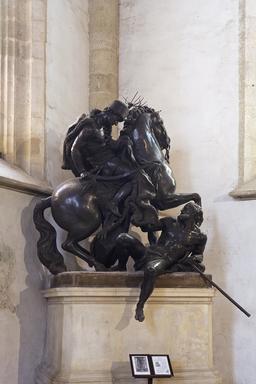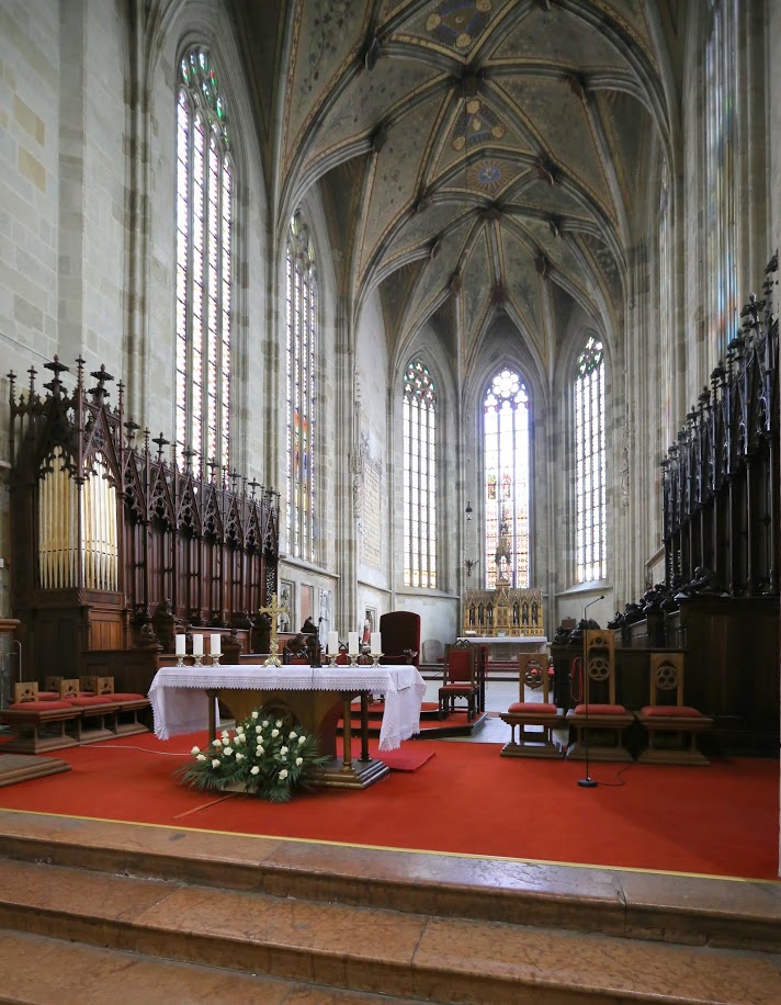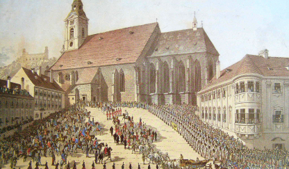 From 1563 to 1830, 11 kings and 8 queens, including Maria Theresa, were crowned here. The first church on this site was built in 1221 in the Romanesque style. A new church was built on the site of the old church in 1311-14, and in later centuries this building was also rebuilt and enlarged several times. It was rebuilt in its present form between 1863 and 1878. The interior of the church is 69,3 m long and 22,85 m wide. The tower is 87 metres high. The cross was replaced by a decorative pillow on which the 300 kg gilded Hungarian crown was placed. The naves of the dome are separated by two rows of eight columns. In the south nave stands a masterpiece of Baroque art, a statue of St. Martin and the beggar by Georg Raphael Donner. The symbolic footprint of Saint Martin, inaugurated by Bishop Jan Orosch and Mayor Andrej Ďurkovsky on 11 November 2007, is placed on the pedestal of the statue.