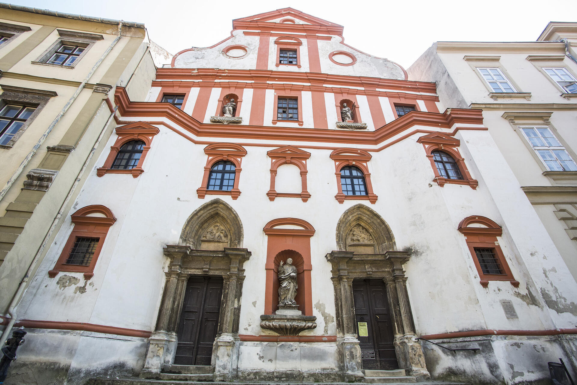 The culprit, as punished by Pope Boniface IX, donated a plot of land, where construction began in 1393 and the church was built within five years. The church was used by evangelicals between 1555 and 1673. After the fire of 1676, the Jesuits restored the building in Baroque style. A statue of Mary and St Joseph was placed on the façade. The eight side chapels and the entire interior wall were decorated with stucco. Its altars, statues, pews and pulpit are richly decorated in Baroque style. The church houses the oldest organ in Hungary, the work of the Viennese master Johann Wöckherl from 1633. In 1869, the Baroque tower attached to the main façade was pulled down to the street. The new 55-metre-high tower was built on the opposite side of the church, on the rondelle of the castle wall. It bears the Latin inscription 'Built for the glory of God in 1882'. The restoration after the devastation of the World War has revealed the medieval parts found under the Baroque architecture.