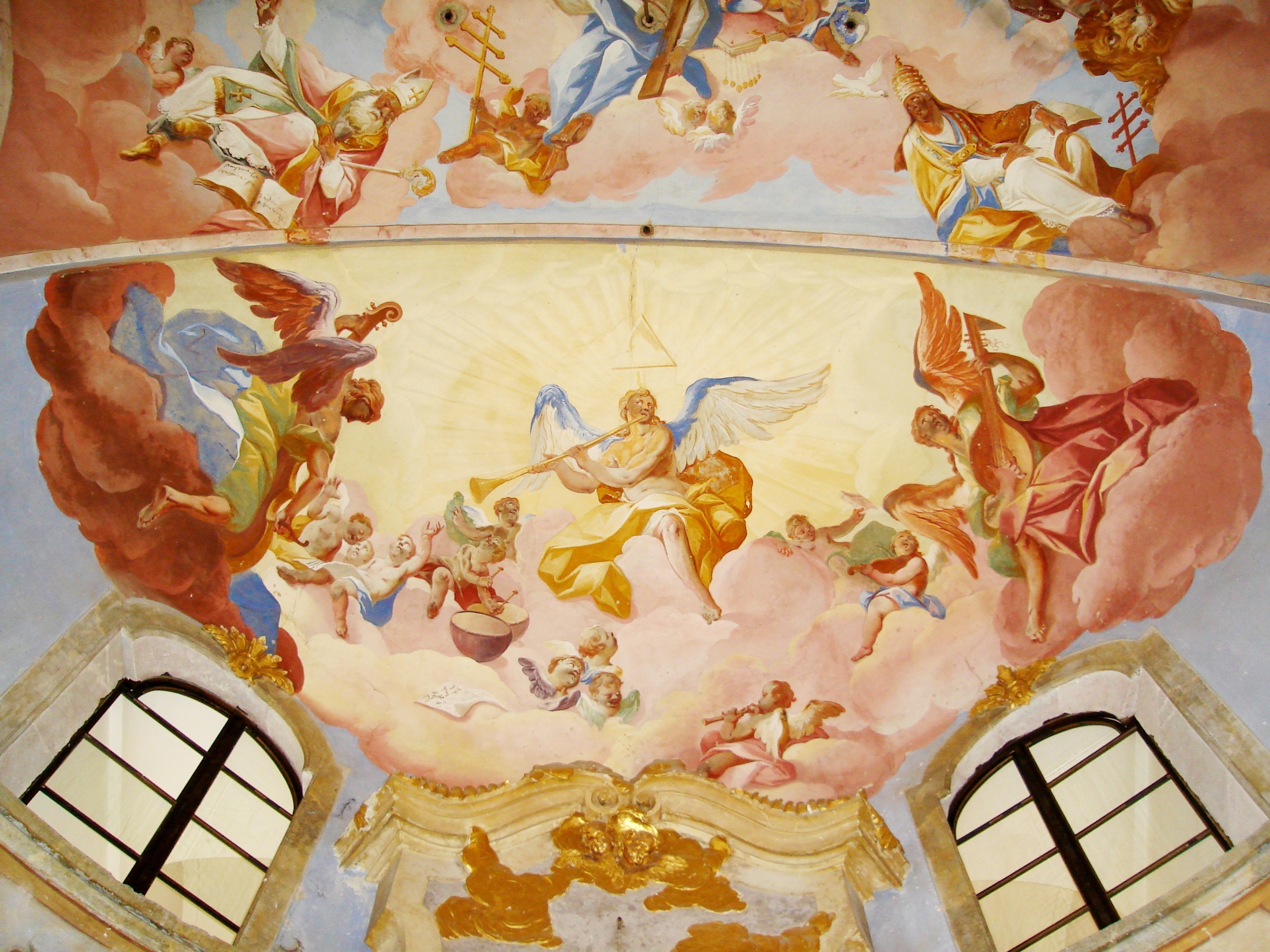 The chapel's vault features an allegorical fresco and the altarpiece depicts the Coronation of Mary and the Holy Trinity. There was once an ornamental garden with fountains around the palace and in front of the façade. Under the building are two large vaulted cellars. One of them had a passageway, now collapsed, which (according to legend) could have led to the woods beyond the stream or as far as Sopron.