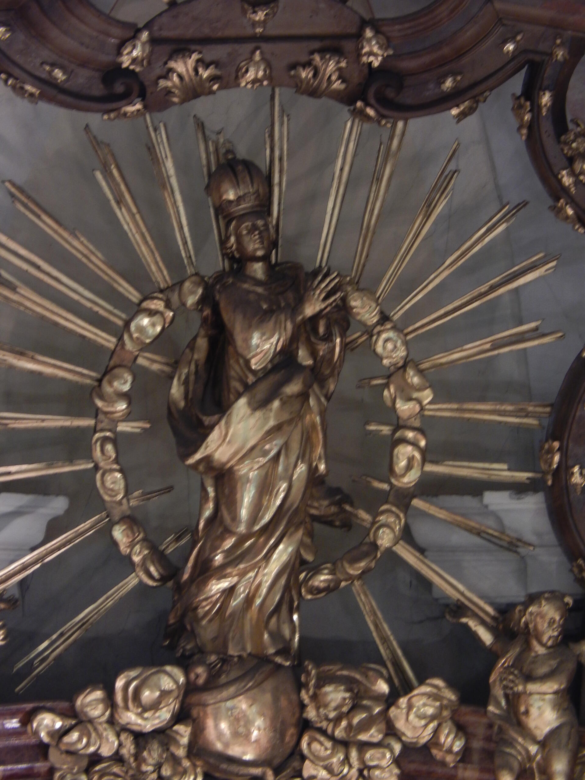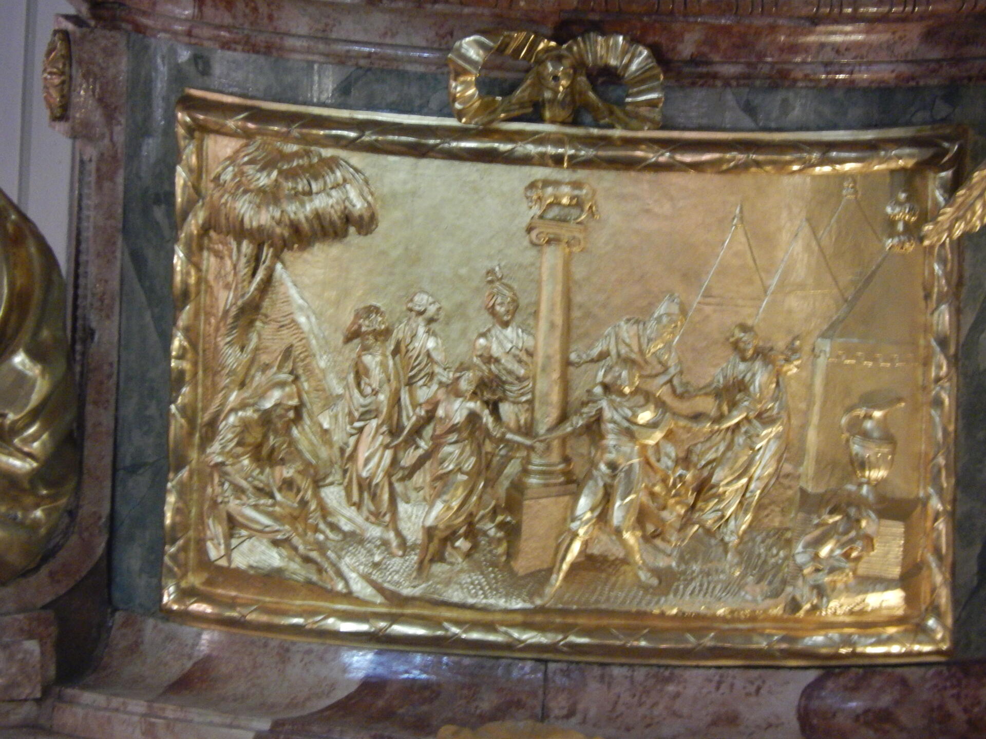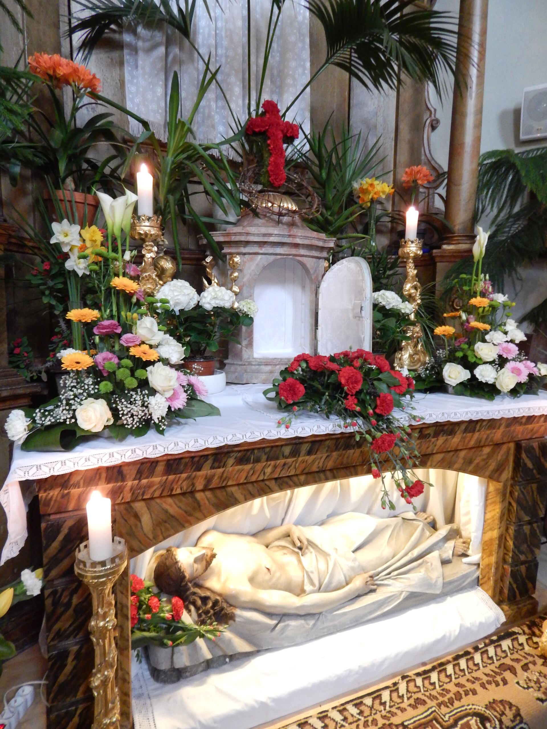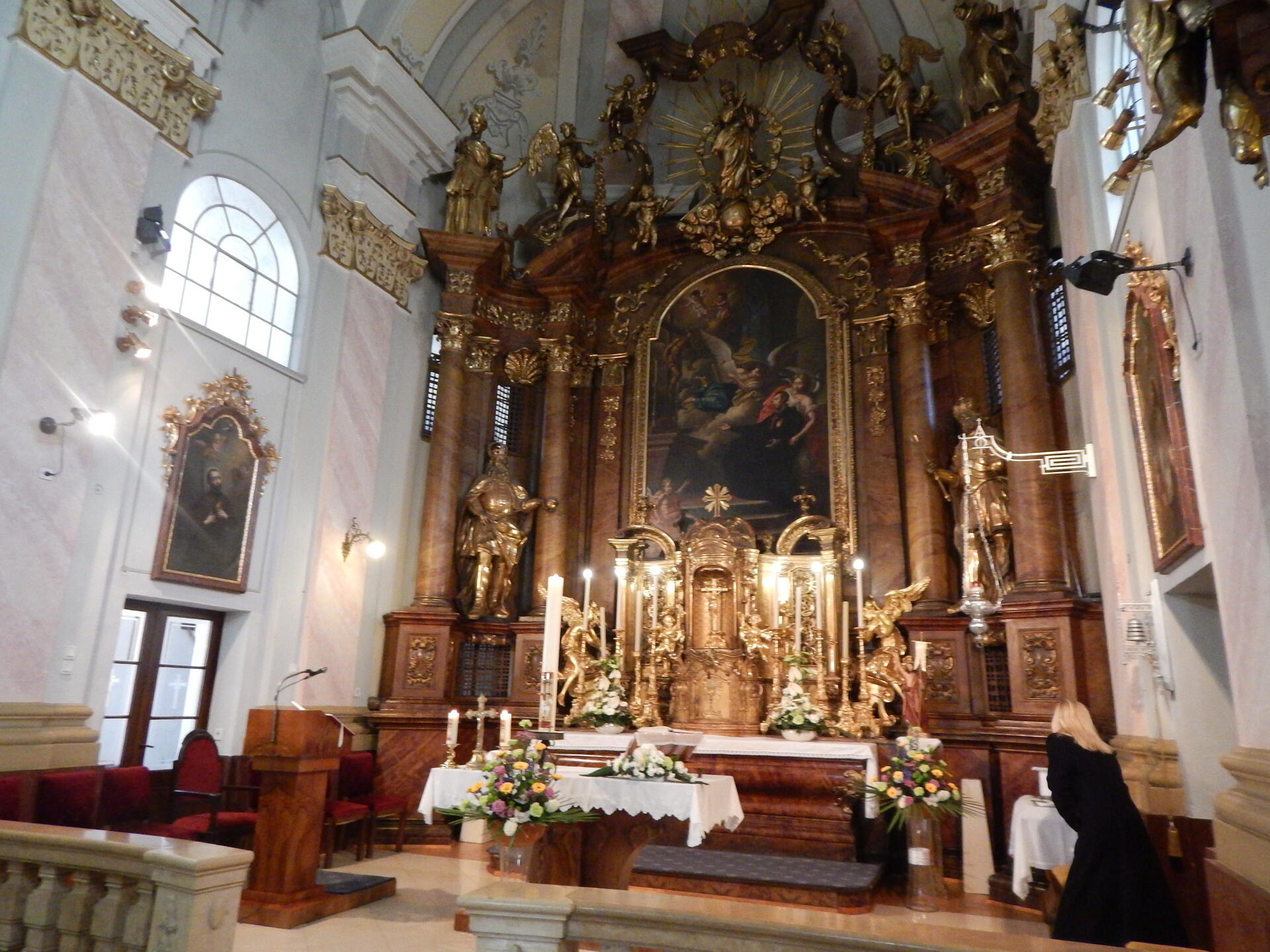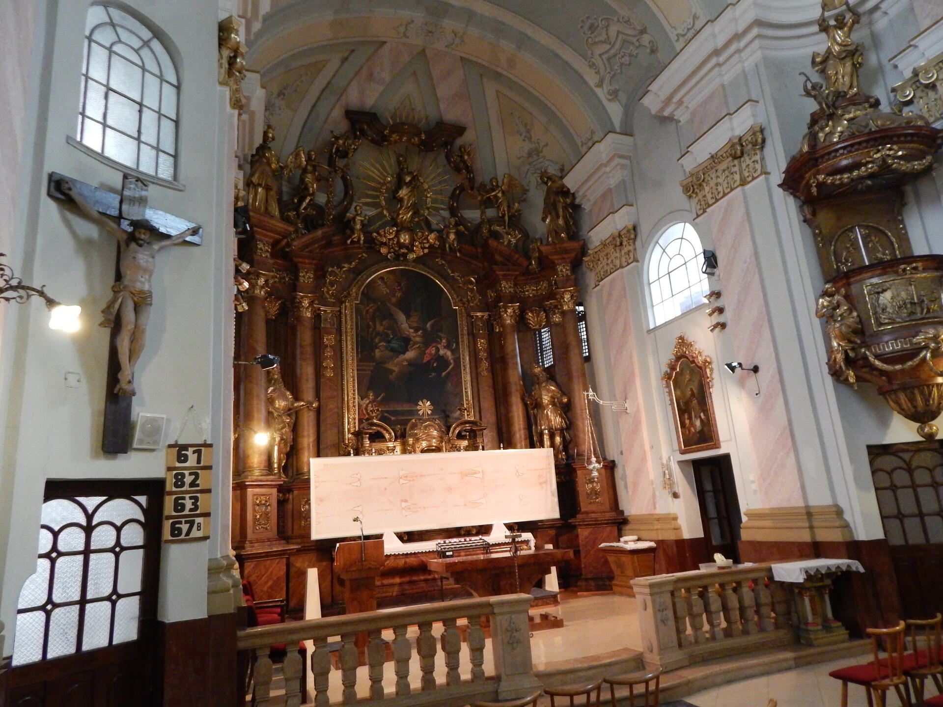 The altarpiece filling the back wall of the sanctuary has 15 gilded wooden sculptures. The central figures of the group are the Virgin Mary clothed in the sun at the top, and St Stephen and King Laszlo on either side. The main altarpiece, depicting the divine experience of St. Camillus, was painted in 1780 by Antonio Capacci of Florence. The nave is decorated with four side altars. The relief of the pulpit-melodeon is related to the movement of the statue on the soundpost: Moses, lifting the tablets of the Ten Commandments, is about to throw them into the midst of the people who are about to worship the golden calf. An exact copy of Jesus' burial shroud, preserved in Turin, is on display in the parish church.
