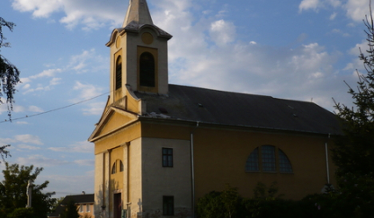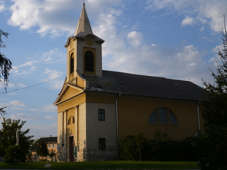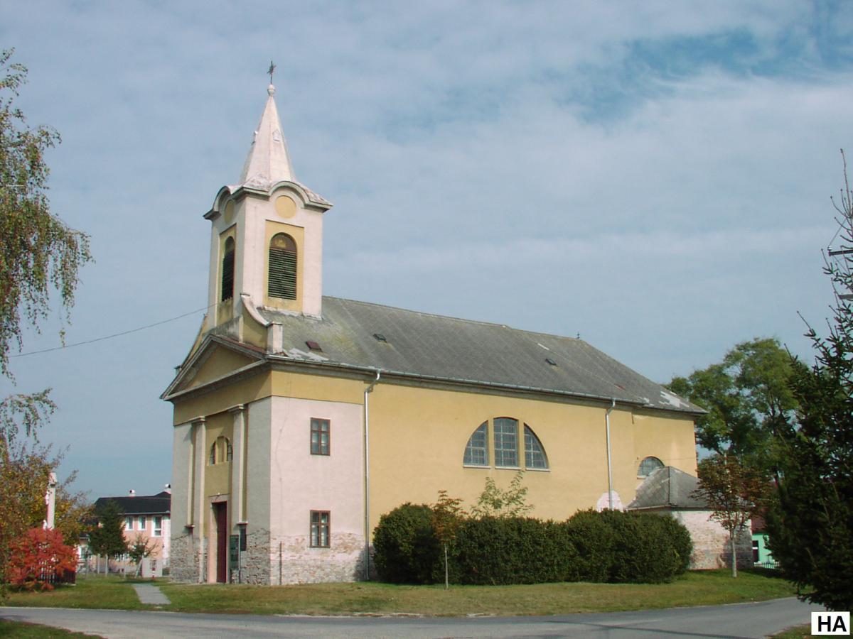 The former church of the village was built by the Héderváry family, then György Széchényi, Archbishop of Esztergom, had it restored after the Turkish-era ruin. On 1 September 1845, 41 houses of the village and the church burnt down. The present house of worship was built between 1847 and 1849, based on the plans of János Lengerer. In 1876, parts of the building, which had been submerged by flooding, had to be demolished, rebuilt and re-founded. The church has recently been completely renovated, with decorative pavement and paving stones around the church. The building is in a neoclassical style. The baroque pulpit was taken from the neighbouring church of Dunaszeg. The paintings in the nave are 19th-century copies, while the picture in the sanctuary is by Zsolt Malasits. The pews were made by Károly Schreiner, who also restored the baptismal font in 1783. The organ, built in 1906, is a product of the Rieger factory. Of its bells, the smaller of the 57 cm diameter, 98 kg, was cast in 1740.