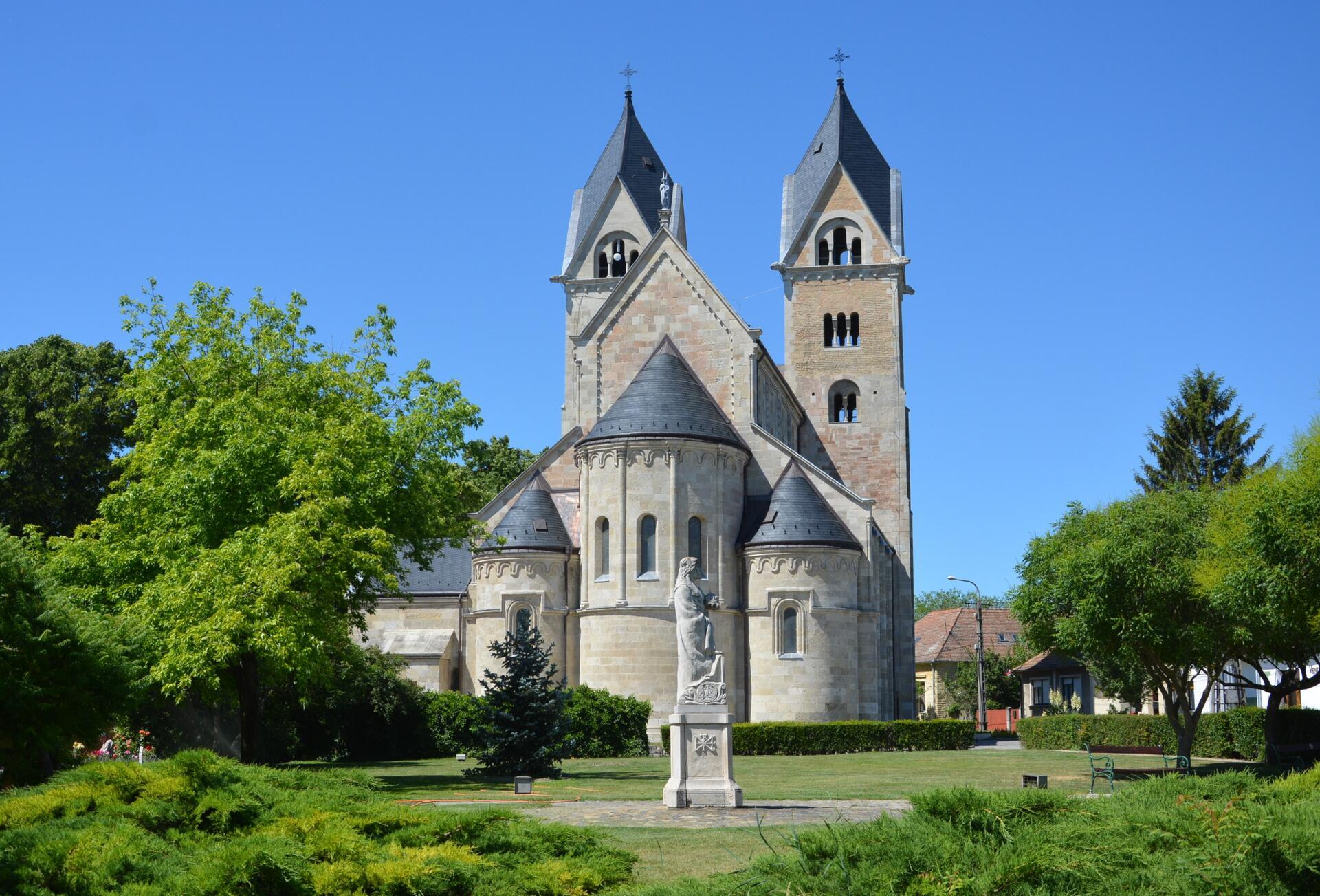 A bencés szerzetesek az Árpád-korban települtek Lébénybe. Az apátságot egy 1199-es keltezésű oklevélben már említik. A falu legmagasabb pontján álló templom 1212-ben épülhetett. Védőszentje Szent Jakab apostol. A román stílusjegyeket hordozó épület 30–33 méter magas, zömök főhajóból és két mellékhajóból áll. A főhajó belmagassága 16 méter. Nyugati oldalánál a román kori bélletes oszlopos kapun léphetünk be, melyen megcsodálhatjuk a gazdag levéldíszítést és a két fejplasztikát, amelyek a legenda szerint az építtető apát és az építőmester arcát mintázzák. A kapu fölött secco ábrázolja a Háromkirályok imádását. A déli homlokzatot a nyugatinál szerényebb bélletes kapu díszíti.