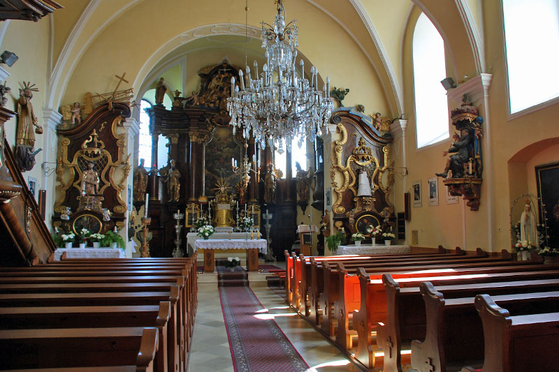 Az egyhajós, kéttornyos barokk épület belsejét dongaboltozat fedi. A hajó mennyezetét freskók díszítik.