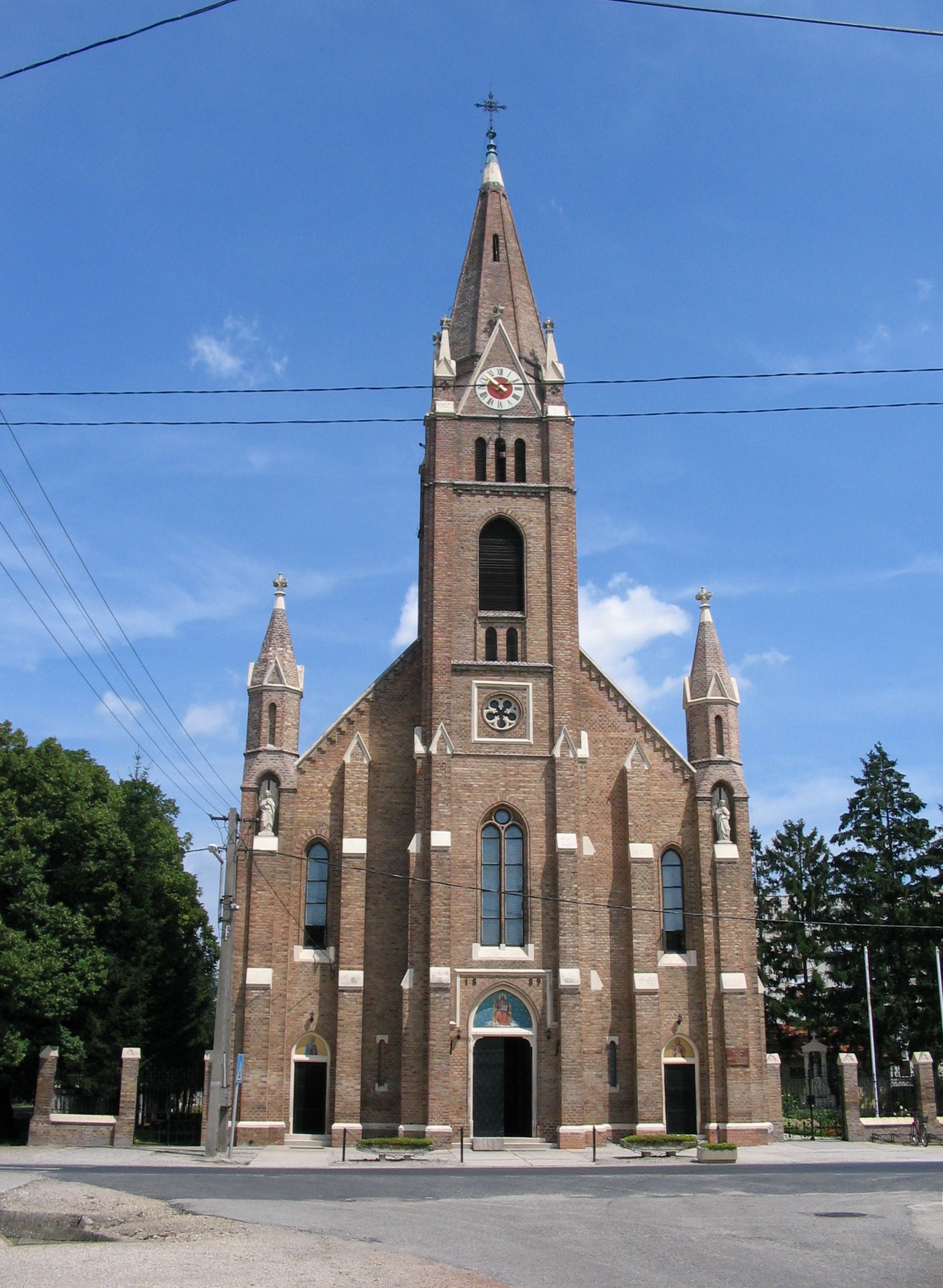 A nagyméretű neogótikus templom 1889-ben épült. Homlokzatának közepén magas torony ugrik előre, sarkain egy-egy huszártorony áll. A templomban található Cziráki Margit síremléke, nyughelye (Gróf ciráki és dénesfalvi Cziráky Margit (Dénesfa, 1874. augusztus 11. – Eszterháza, 1910. augusztus 18.) az Esterházy család hercegi ágának tagja, Esterházy Miklós felesége).