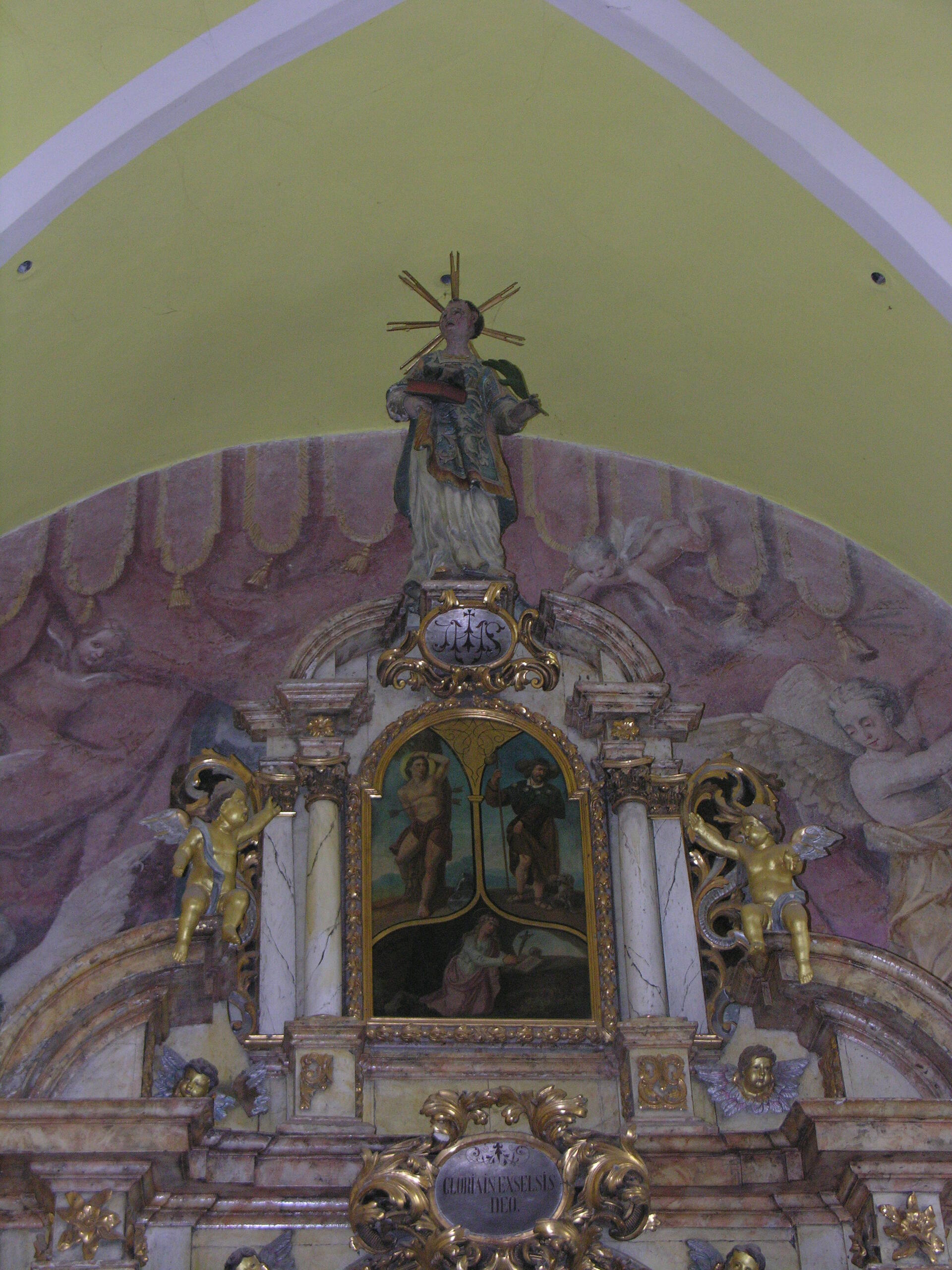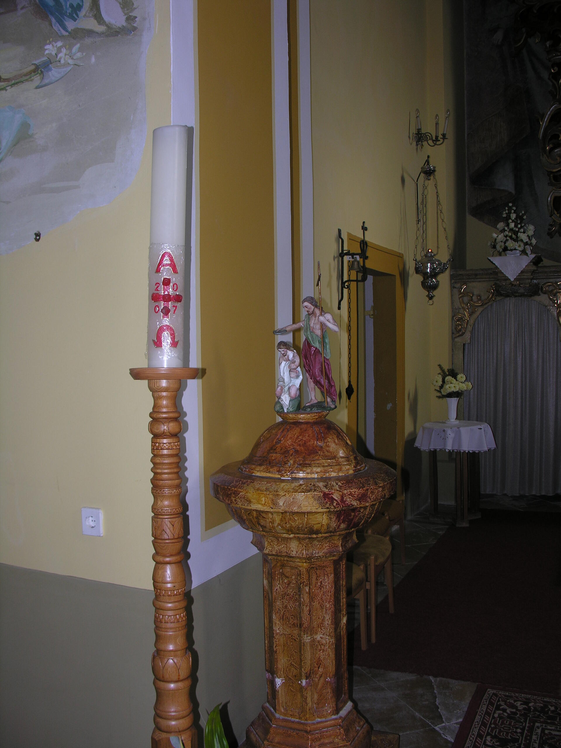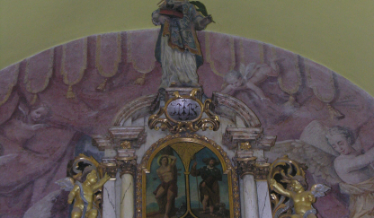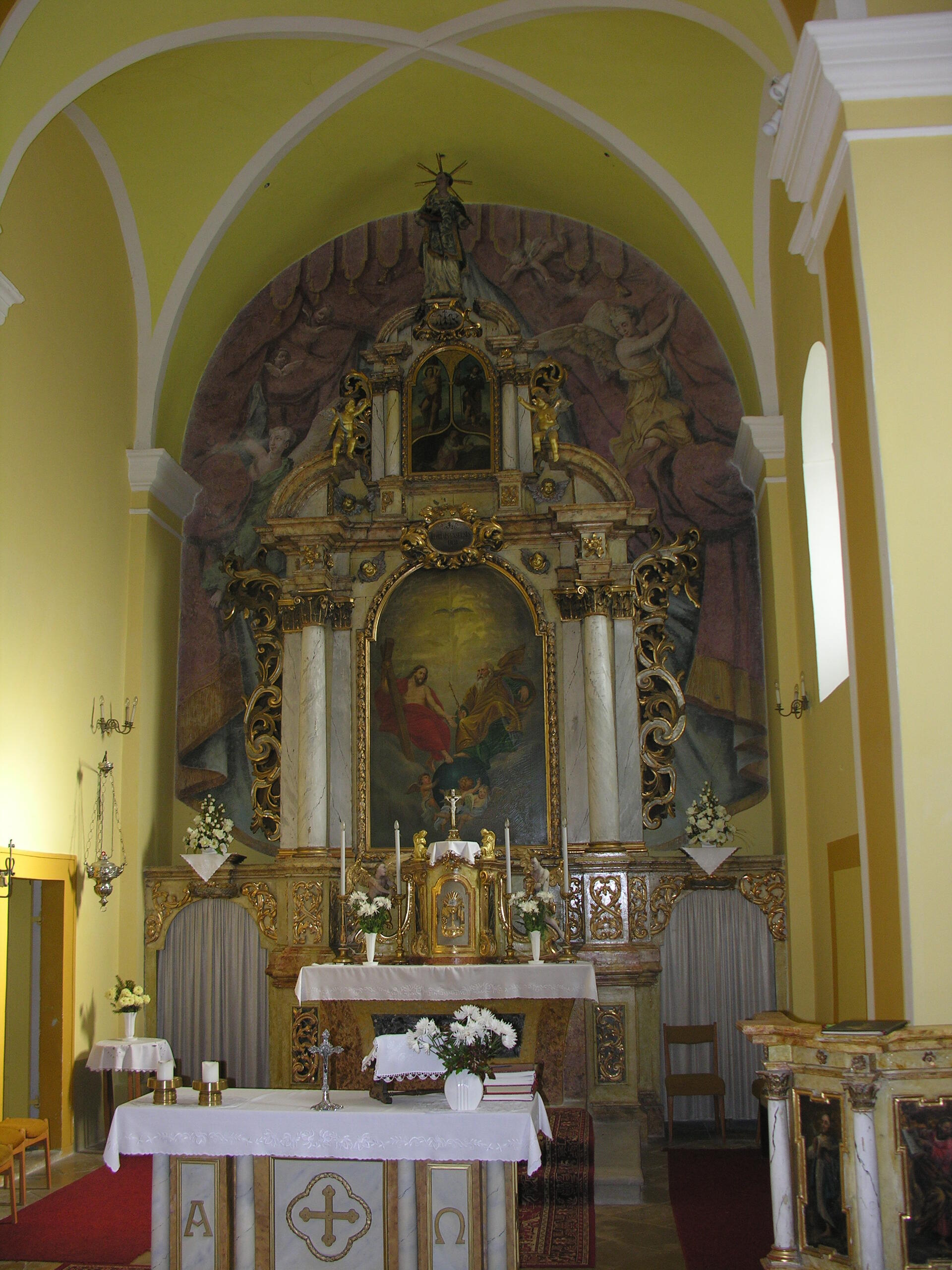 A templomot a török dúlások után, majd az 1829-es árvíz után is újjá kellett építeni. A barokk oltár nagyképe a Szentháromságot ábrázolja. A felső, háromrészes képen Szent Sebestyén, Szent Rókus és Szent Rozália látható. Értékes barokk munkák a szószék-mellvéd táblaképei, valamint a keresztelő medence tetején álló, Jézus megkeresztelkedését megjelenítő kis szoborcsoport. 1991-ben a II. világháborús emléktáblát avattak a templom falán.