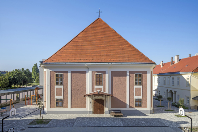 A templom 1784-85-ben épült, zárt udvarban és torony nélkül.